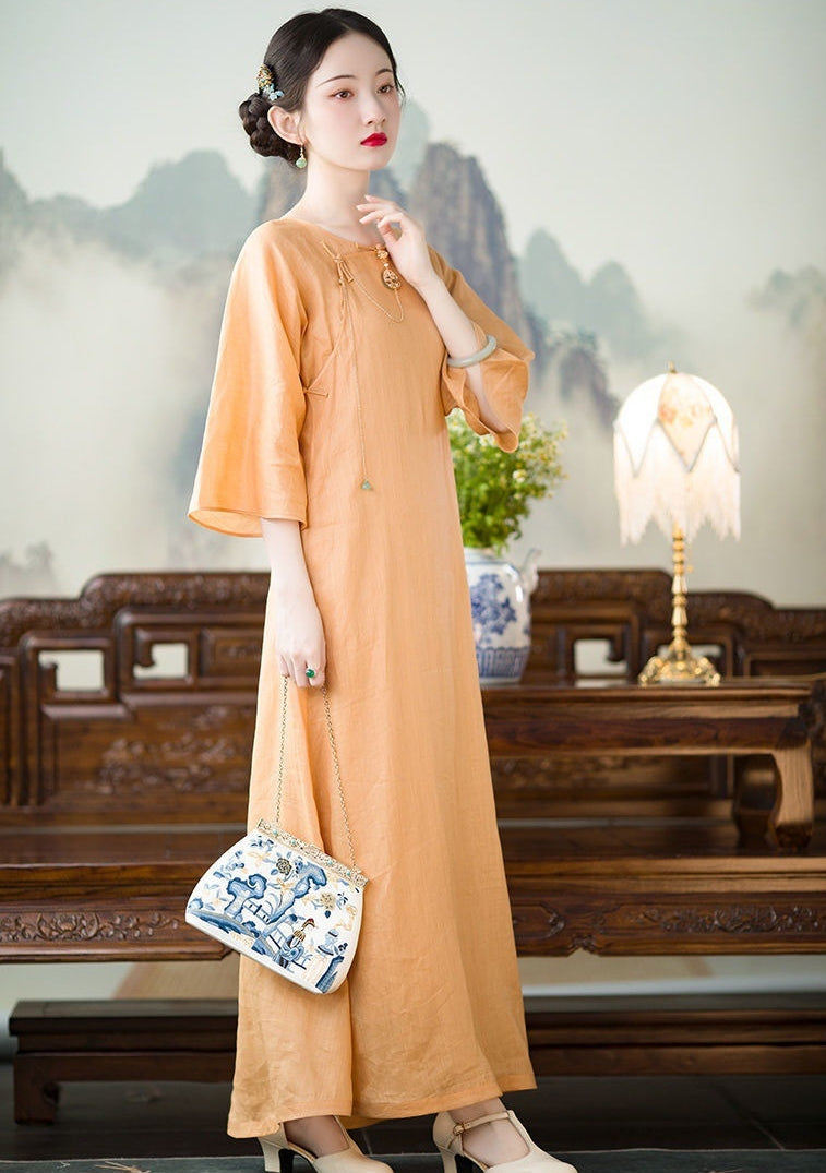 Chinese Style Loose Cheongsam Dress with Round Neck and Trumpet Sleeve