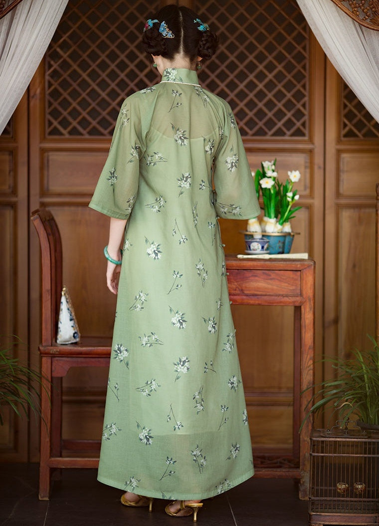 • Chinese Style Loose Floral Qipao Dress with High-end Collar and Trumpet Sleeve
