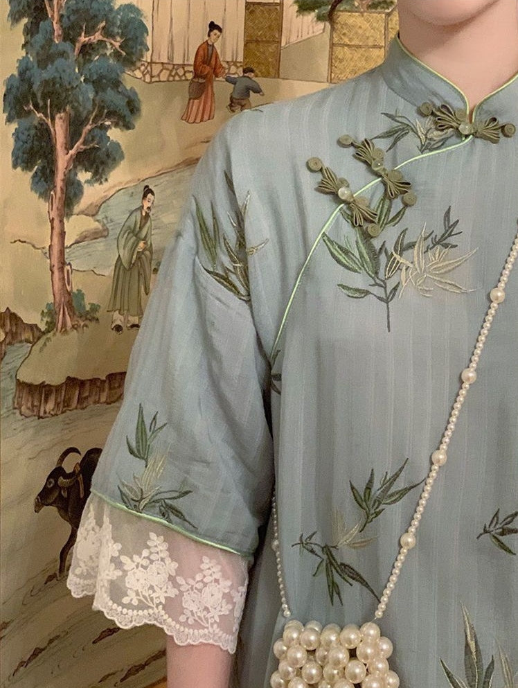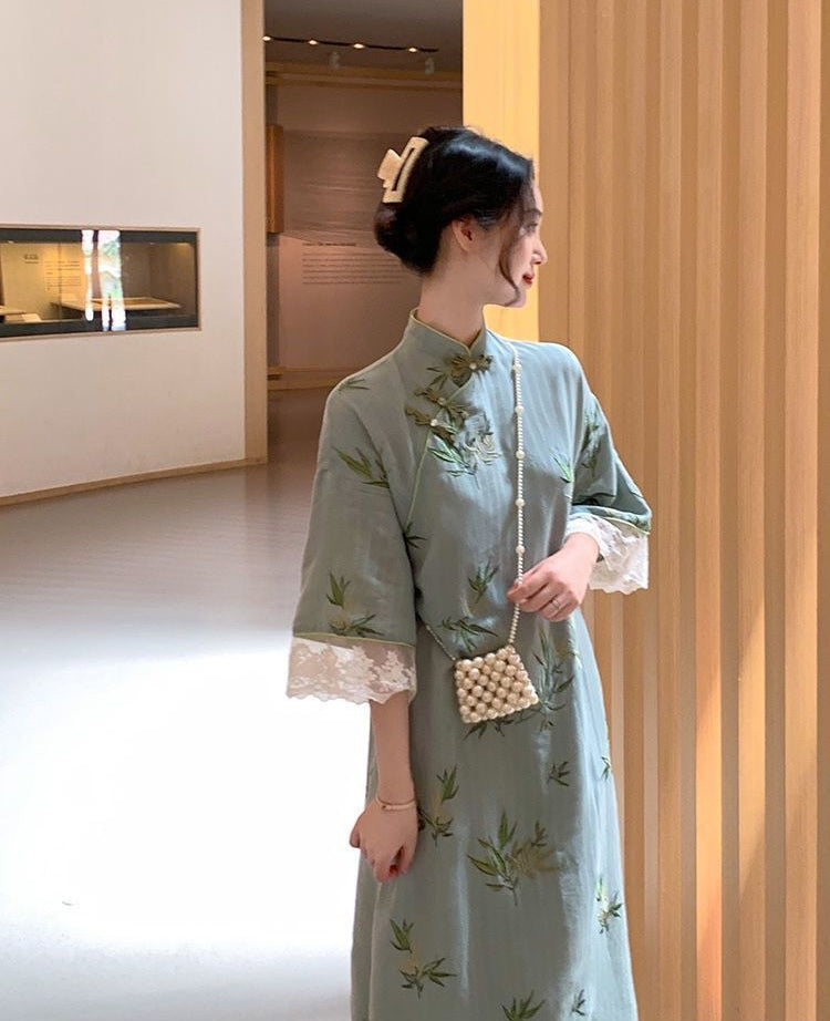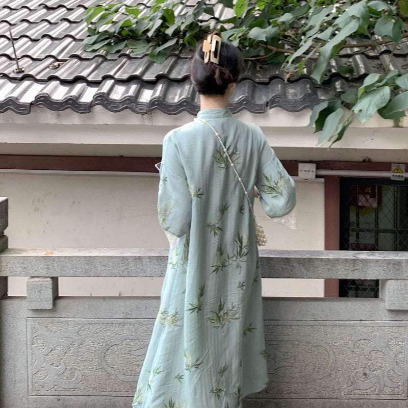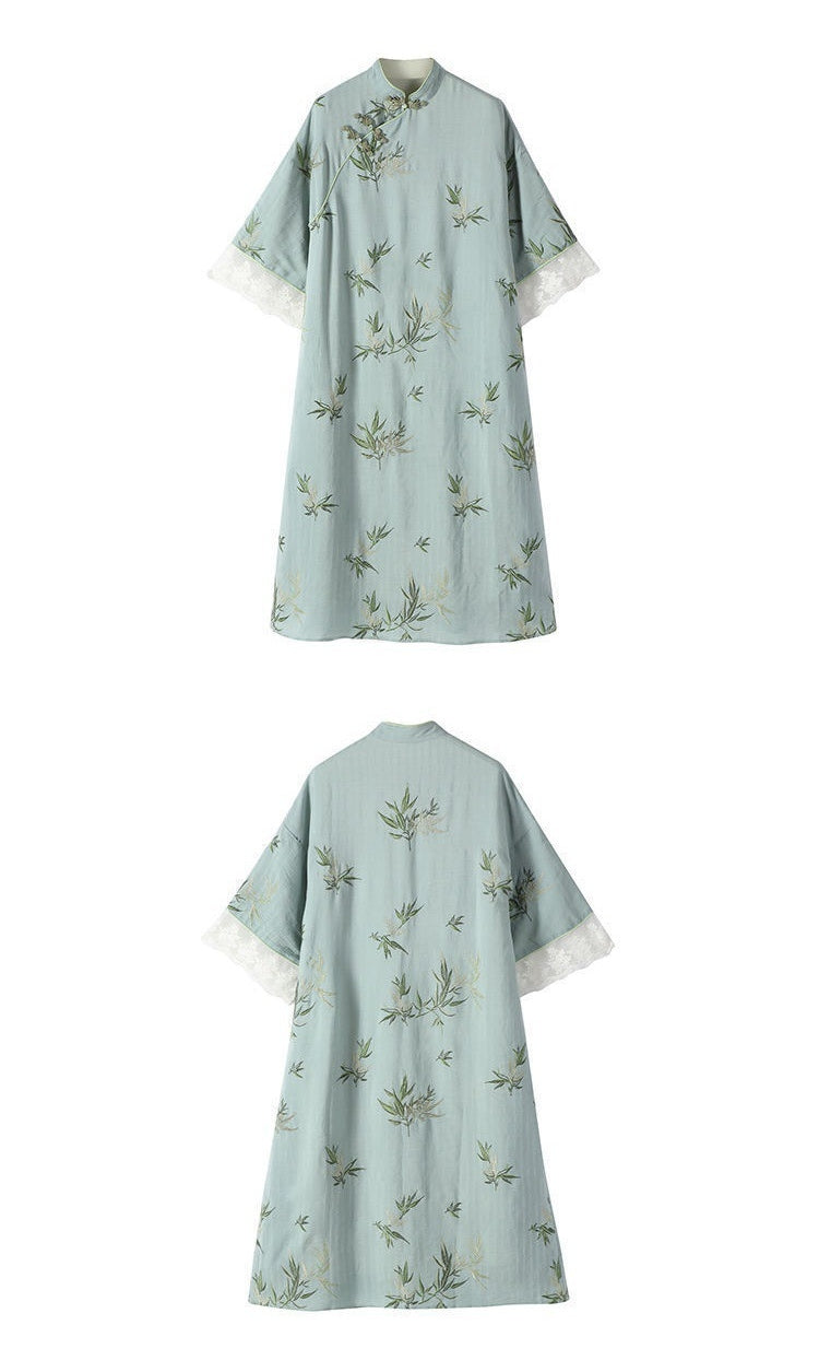Retro Artistic Floral Print Cheongsam Loose Qipao Dress with Lace Cuff