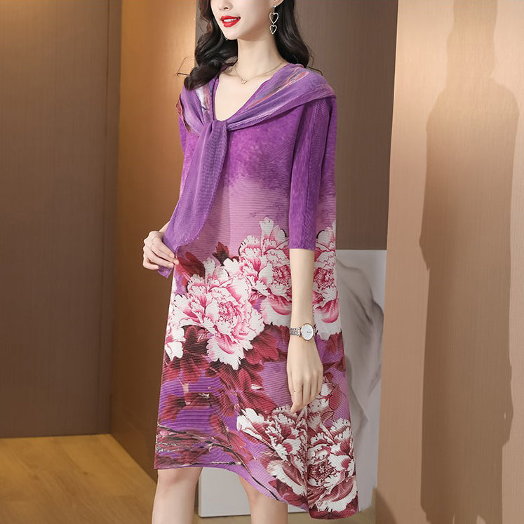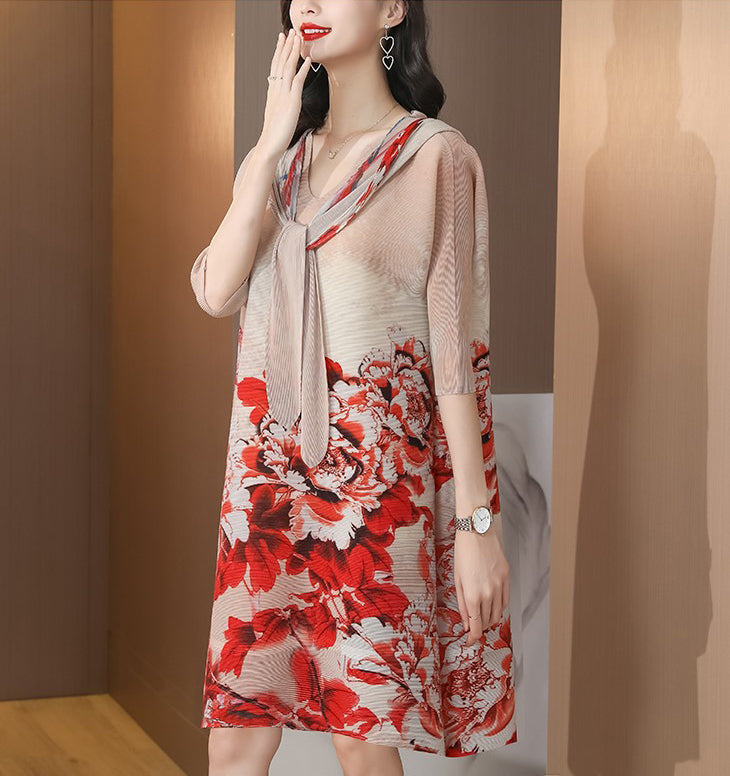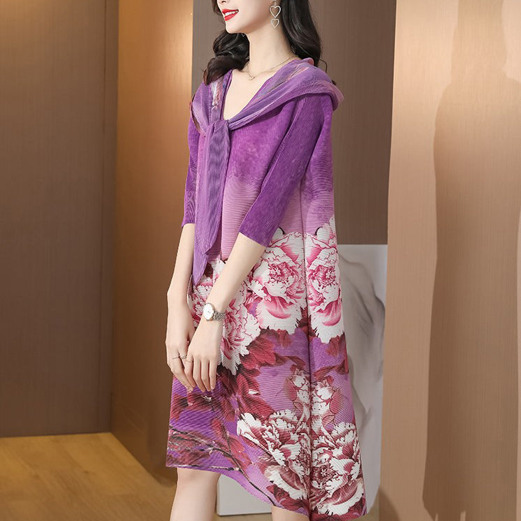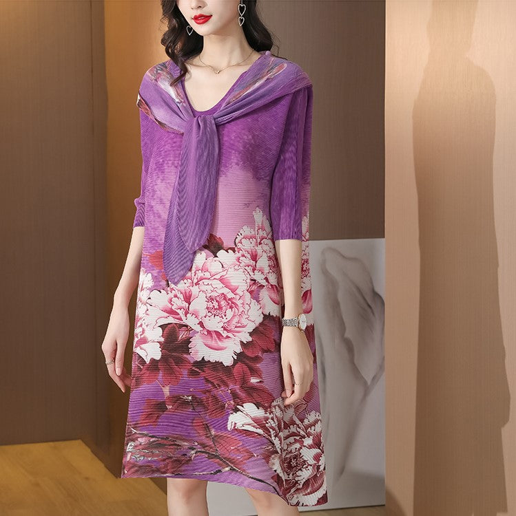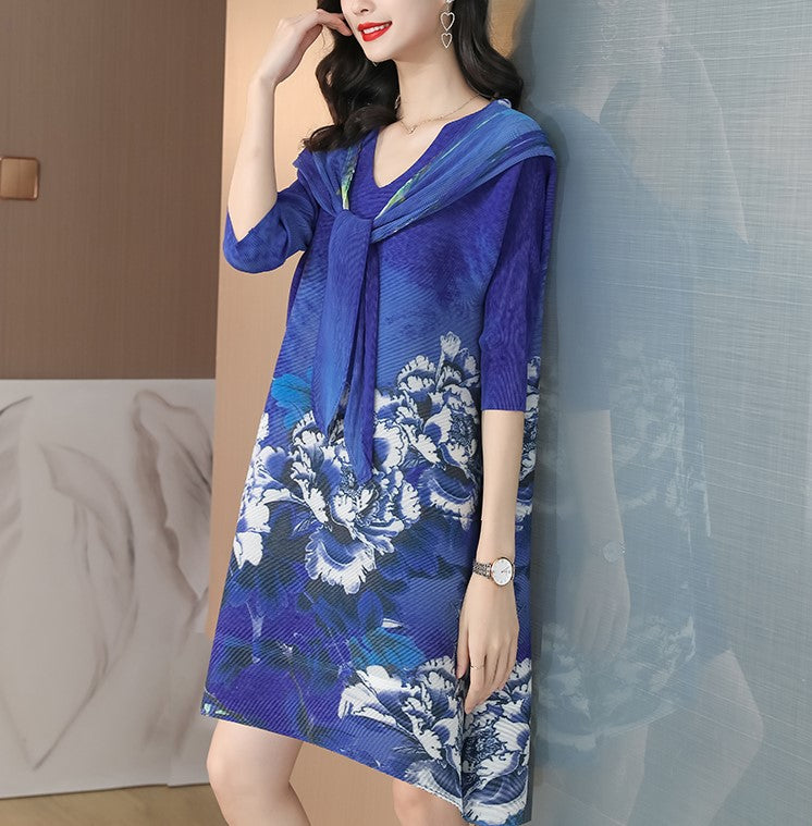 Round Neck Folded Floral Chinese Style Casual Dress with Neck Scarf & Hat